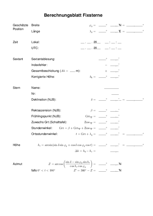Auf dieser Seite finden Sie die wesentlichen Tabellen, die Sie für die Ortsbestimmung auf See mittels Sextanten und Uhr benötigen. Die Tafeln sind mit den Algorithmen gemäß der IAU-Empfehlung gerechnet. Für Sonne, Mond und Planeten wird das Integrations-Modell des JPL benutzt. Als Katalog für die Fixsterne wird der Hipparcos-Katalog verwendet.Die Auswahl und Nummern der Navigationssterne sowie das Layout ist für die leichtere Verwendung für deutschsprachige Segler an das Layout des offiziellen Nautischen Jahrbuchs angelehnt. Das offizielle Nautische Jahrbuch wurde leider von der BSH eingestellt. Eine aktuelle Ausgabe wird aber als Print-on-Demand herausgegeben: Nautisches Jahrbuch 2025. Mit dem Erwerb der Print-Ausgabe unterstützen Sie ebenfalls diese Web-Site! Ausserdem enthält es noch zahlreiche weitere nützliche Tabellen und Beispielrechnungen.